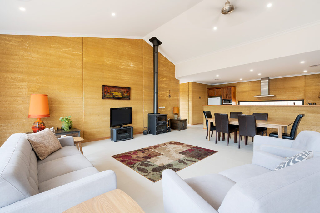 Designed and built to be spacious, this retirement home is low maintenance and energy efficient. Constructed in Chewton, it features 440 square metres of natural and unique rammed earth walls.
